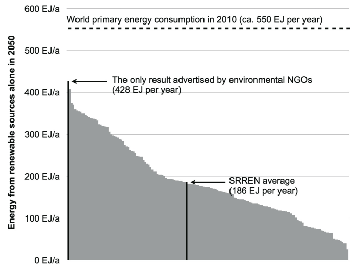Lyckligtvis behöver vi inte sitta och gissa om det, för andra har gissat åt oss, och gjort det bättre än vi själva kan göra. Jag talar om IPCC, som släppt en jätterapport om förnybar energi – SRREN. Jag har verkligen inte läst hela, men jag har skummat och bläddrat. I den har man bland annat försökt skatta hur mycket förnybar energi det i praktiken går att få fram till 2050, och har beaktat över hundra olika scenarier. Närmare bestämt 164 stycken.